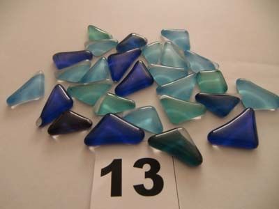Ondoorschijnend glas. Door de witte achterkant hoeft de ondergrond van je mozaïek niet bewerkt te worden. Ieder stukje varieert in afmeting.