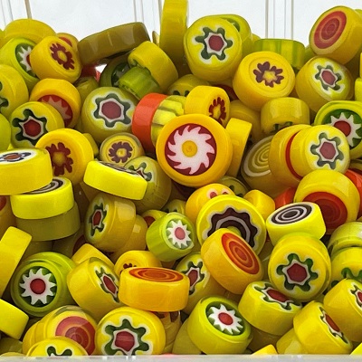 Deze millefiori is niet geschikt om te fusen. In 25 gram zitten ongeveer 25 tot 30 steentjes Grootte: 8-12mm Dikte ongeveer 4 tot 5 mm