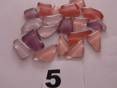 Ondoorschijnend glas. Door de witte achterkant hoeft de ondergrond van je mozaïek niet bewerkt te worden. Ieder stukje varieert in afmeting.